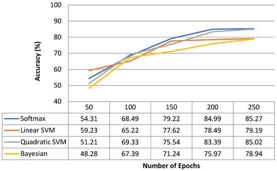 On an 80/20 ratio, the best achieved results using the softmax classifier are 87.67% precision, 80.13% recall, and 85.27% accuracy. Results achieved by applying multiple classifiers using our proposed model are shown in Table 3. It is evident from Table 3 that quadratic SVM performance is also satisfactory and near to that of softmax. Moreover, the testing accuracy graph based on the model trained for the 80/20 train-to-test ratio is also shown in Figure 8.