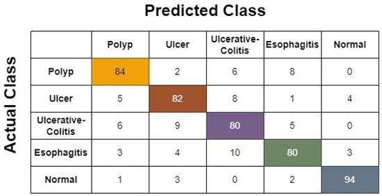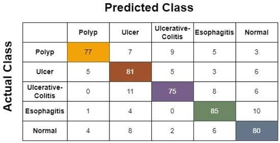 The confusion matrix generated based on the 60/40 ratio using the softmax classifier is shown in Figure 13. Looking at the results, it is clear that while using this ratio, model performance worsens, as three polyp cases, six ulcer cases, six ulcerative colitis cases, and ten cases of esophagitis were predicted as non-diseased. Moreover, it is also a great concern that 20 of the normal cases were treated as disease cases. We believe that the behavior of the model worsened as training data were reduced; hence, the model was not properly tuned.