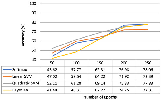 For 10-fold cross-validation, the best results achieved using the softmax classifier are 99.68% precision, 96.13% recall, and 98.32% accuracy. Results achieved by applying multiple classifiers using our proposed model are shown in Table 6. It is evident from Table 6 that the quadratic SVM as well as Bayesian performances are satisfactory, and cannot be ignored. Moreover, the testing accuracy graph based on the model trained with 10-fold cross-validation is depicted in Figure 14.