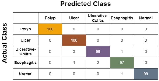The confusion matrix generated based on the 70/30 ratio using the softmax classifier is shown in Figure 11. Looking at the results, it is clear that while using this ratio, the model performs much better, and only one disease case is treated as normal, which is in the esophagitis class. Moreover, only four of the normal cases are treated as disease cases.