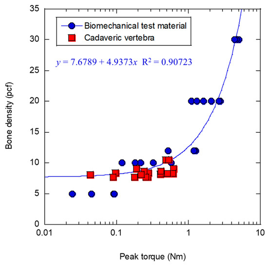 The percentage of luminance values greater than 4000 obtained from micro-CT scans ranged from 0.486 to 0.664, with a mean value of 0.537 and a standard deviation of 0.0513. The absolute value of the bone density was determined from the proportions obtained from phantom measurements [25] in previous studies. In this study, an approximation was made by fitting a high coefficient of determination of the peak torque and bone density at the time of implantation obtained from the simulated bones, as shown by the circular plot in Figure 2. The percentage of the peak torque evaluation results for each cadaveric bone with a luminance value of 4000 or higher was used as the bone density to determine the bone density shown in the square plots to minimize the squared error with fitting. As a result, the bone density of the cadaveric bones was estimated to be equivalent to 7.73 pcf to 10.5 pcf. The bone density was included into the dataset as a clinical parameter, yielding a total of 65 variables and utilizing a dataset standardized by each explanatory variable.
