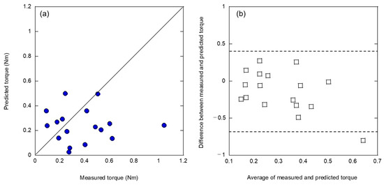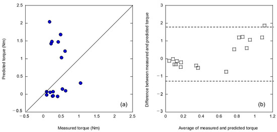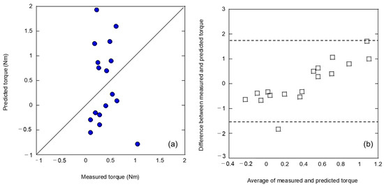 Analysis result of (a) relationship between measured and predicted insertion torques and (b) Bland–Altman plot by limiting the peak torque range to the same as that of the cadaveric bone dataset.