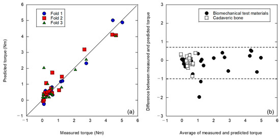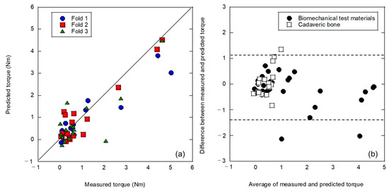 Analysis results of a three-fold cross validation using a mixed dataset of artificial and cadaveric bones without bone density: (a) relationship between measured and predicted insertion torques; (b) Bland–Altman plot.