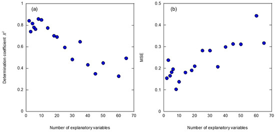 Performance change in (a) coefficient of determination and (b) MSE when introducing SVR for the explanatory variables prioritized by LASSO.