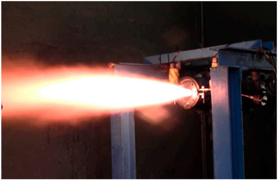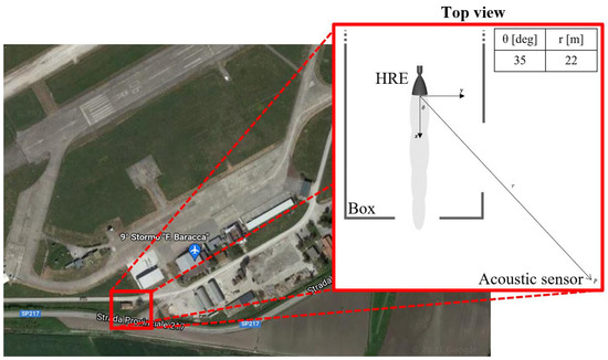 The acoustic sensor was deployed at a distance of 22 m from the nozzle exit and at 35° to the plume exhaust axis. Instead, the test article, a 1000 N paraffin-based HRE, was attached to the mount and fixed parallel to the ground in a partially open facility (Figure 7).