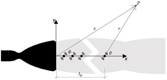 Figure 2 schematically represents the rocket engine, the set of acoustic sources distributed along the exhaust stream (distance from the nozzle exit measured along the x-axis), and the relative position of the observer (distance r from each source). The angle is defined for each source by the line between the source and the observer (point P) and the jet axis. Finally, the distance s and the angle will be useful to define a unique reference system centered at the nozzle exit.