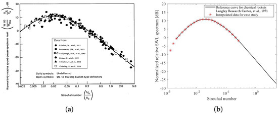 Normalized relative sound power spectrum as a function of Strouhal number. (a) Experimental data for standard chemical rockets with single nozzle (1.56 to 31,100 kN) [15,16,17,18,20,21]. (b) Data interpolation on the basis of case study input information [11].