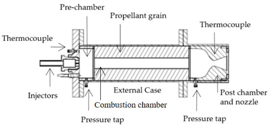 The empirical method applied in this paper [11] is based on past experimental data (from the 1950s and 1960s), and is therefore generally valid for nozzle design, exhaust flow characteristics, and thrusts typical of engines currently in service [11,12]. Consequently, full-scale experimental firing tests are needed to assess the potential for extending current empirical methods for rocket engine designs that differ significantly from existing configurations. For this purpose, in this work the jet noise of a low-thrust hybrid rocket engine (HRE) is first predicted according to the empirical procedure provided by Eldred [11] and then compared with acoustic measurements of the sound field around a static firing test. In detail, the engine under investigation (Figure 1) consists of a paraffin fuel pellet cast and cured in the combustion chamber and a liquid oxygen stored in a separate tank and injected under pressure into the pre-combustion chamber. It was developed as part of the Italian Aerospace Research Centre’s HYPROB project with the aim to improve the national system and technological capabilities on liquid (oxygen/methane) and small-scale hybrid rocket engines [13]. Such a hybrid engine offers several advantages over its solid and liquid counterparts and could therefore result in a viable alternative propulsion system for spacecraft and rockets [14]. Notable among them are higher performances, safety, storage, operability, reduced environmental impact, lower system cost, and high reliability [15].
