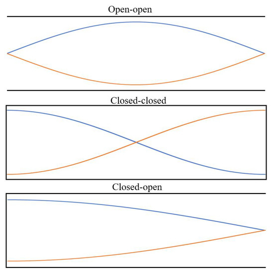 A simplified test was designed to investigate the acoustic properties of the HRE cavities, in which the combustion chamber cavity was connected to a modified volume representative of the post-combustion chamber (equivalent simple tube representing the cavity equipped with the nozzle). Based on the type of the acoustic boundary condition different cavity resonance frequencies and modes (Figure 10) are possible [20]. For instance, for a tube with an open end and a closed end longitudinal standing waves with frequencies equal to can be established whereas for a tube closed at both ends or open at both ends, the wavelength associated with the fundamental frequency is twice the tube length, so, the natural frequencies will be . Specifically, n is the mode index, L is the effective acoustic length, and c is the speed of sound.
