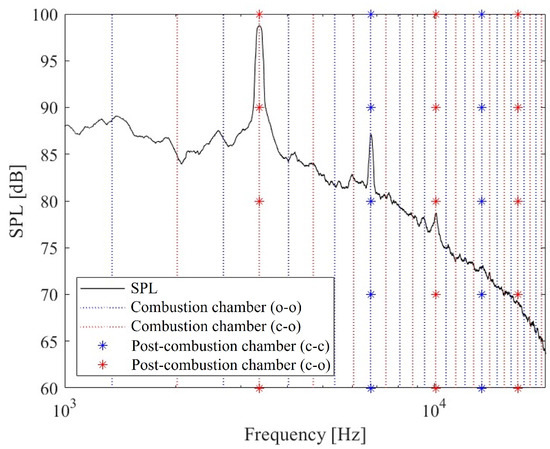 The pipe eigenfrequencies for various boundary conditions were then evaluated and overlaid on the jet noise spectrum in Figure 11. The blue dotted line and the red dotted line indicate the chamber eigenfrequencies for the open–open (o-o) and closed–open (c-o) boundary conditions, respectively, while the blue and red stars represent the eigenfrequencies corresponding to the post-chamber modes with c-c and c-o boundary conditions, respectively.