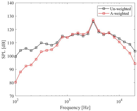 In order to compare the experimental data with the theoretical predictions, the narrow-band sound pressure level was converted into one-third octave bands, as shown in Figure 12. In addition, A-weighting was applied to the SPL in an effort to describe the effective level perceived by the human ear, which is less sensitive to low frequencies.