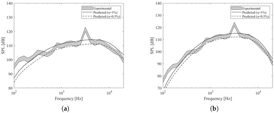 For the reasons explained above, the expected experimental SPL range (without reflection component) is obtained by subtracting 3 and 6 dB from the original experimental curve (gray band). The solid and dashed black lines represent the predicted curve (obtained by Eldred’s procedure) assuming 1% and 0.5% acoustic efficiency values.