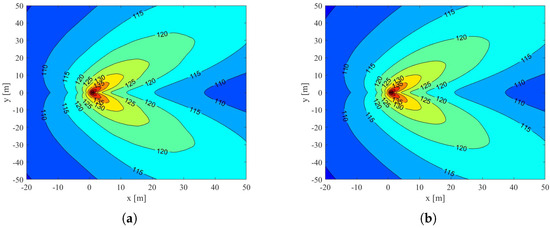 Acoustic field estimated on an area 70 × 100 m (1% of acoustic efficiency). The engine is located at the origin of the axes (0,0), while the plume is oriented along the positive x-coordinate. (a) Un-weighted OASPL. (b) A-weighted OASPL.