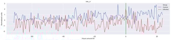 The green line indicates the moment when the blood samples were taken. Interestingly, the figures clearly indicate that not all features are linearly separable and thus are of a non-linear nature. For instance, it was observed that the Δ nn_20 feature (see Figure A1) scored significantly higher for the infected patients than for the control patients for periods around t0 = −48, but around t0 = −12 this effect was reversed. Furthermore, for the Δ SpO2_median feature (Figure A4), it was observed that the infected group was significantly more volatile than the control group. Lastly, for both the Δ RF_median and Δ PFI_median (Figure A5), it was observed that the infected group had much more seasonality than the control group.