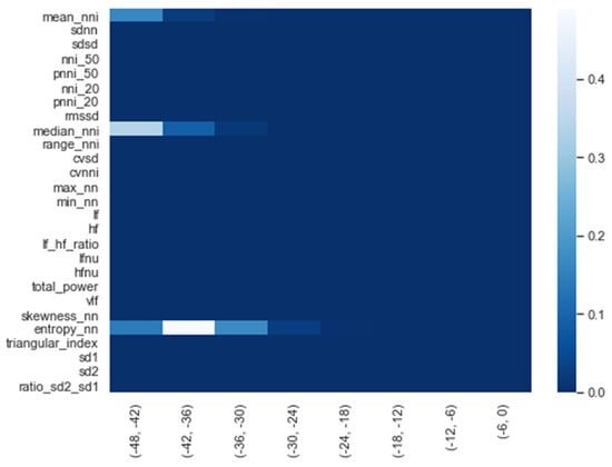 We calculated the significance for each feature for time intervals starting from ti = −48 h until ti = −6 h, at 6 h increments, using a Mann−Whitney U. In Figure 2, a heatmap of the significance of each HRV feature is highlighted and Figure A6 in the Appendix A presents a complete overview of the significance of the features from all of the vital parameters. Interestingly, the results indicate that the significance of each feature differed over time. For instance, Figure 2 shows that the median (median_nni) of the periods ti = −48 till ti = −30 are non-significant. Moreover, the plot shows that the entropy (entropy_nn) feature was not significant around ti = −42 and ti = −36. For the other vital parameters, see Figure A6, we also saw that some features were non-significant. In both PFI and SpO2, it was shown that the mean and median of these parameters were non-significant. Moreover, we saw that in respiratory rate (RF), the skewness (RF_skew) was non-significant. We opted to discard all features with segments that were entirely or partly non-significant.