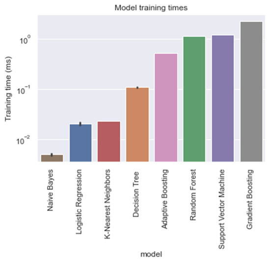 With respect to the training times of the models, RandF turned out to be a less beneficial model. As indicated in Table 4 and Figure 5, we observed that RandF (1.145 ms) turned out to need roughly two times more training time than ADA (0.519 ms). GB turned out to need the most training time (2.249 ms). Moreover, we found that the SVM model also took a relatively long time to be trained (1.220 ms). If we take both training and predictive performance into account, KNN was shown to be the best overall performing model (training time: 0.023 ms; AUROC: 0.950). In Table A3 in the Appendix A, we present the predictive performance of the PCA variant of the dataset. As observed, all models performed worse using this type of dataset. Interestingly, however, when inspecting the relative scores of the models using this dataset, KNN (AUROC: 0.938) and SVM (AUROC: 0.929) performed best compared with the ensemble models RandF (AUROC: 0.921), ADA (AUROC: 0.806), and GB (AUROC: 0.884).