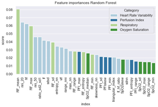 In Figure 6, we present the feature importance of the RandF model. Interestingly and in line with the literature [9], we observed that the HRV features were found to be significantly important. However, we found that the most important feature did not originate from the HRV feature set, but from the RF feature set (i.e., RF_mean). Furthermore, it was observed that perfusion index (PFI) and oxygen saturation (SpO2) were the least valued features.