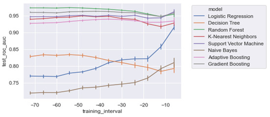 The results also show that relatively adequate results were achieved using the conventional ML models, KNN and SVM, with both yielding an AUROC score of 0.950 and 0.951, respectively, which was comparable to the best performing ensemble models (i.e., GB and RandF). Interestingly, these models even outperformed ADA when trained on a longer time window (ti = −48 to ti = −24; see Figure 5 and Table 5). The strongest overfitting model was found to be the DT model, yielding a 17% lower AUROC score for the test than the training set. The least overfitting models were found to be LogR and NB, yielding an AUROC score of 1% lower on the test set than on the training set. Except for DT, the non-linear models all scored an AUROC score between 2% and 3% lower for the test.