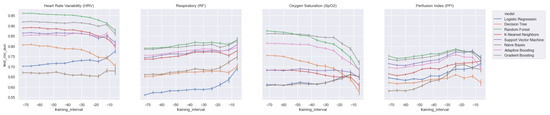 In order to assess the value of each distinct vital parameter (i.e., HRV, RF, SpO2, and PFI) for predicting LOS, we trained each model on each vital parameter separately. In Figure 8, we present the AUROC test scores for all of the training windows (i.e., ti = −48 to ti = −6) for each feature set. As expected, and in line with the literature, the HRV features performed best. However, we also found that the ensemble models (i.e., RandF, ADA, and GB) yielded acceptable results for the feature sets of the parameters SpO2 and RF. In particular, using a training interval from around ti = −48, we found that the models using features from SpO2 outperformed the RF features. On the other hand, we found that while all separate feature sets performed worst around ti = −6, RF performed best around this time interval. Thus, this is an indication that the vital parameters of respiratory (RF) are best used shortly before t0.