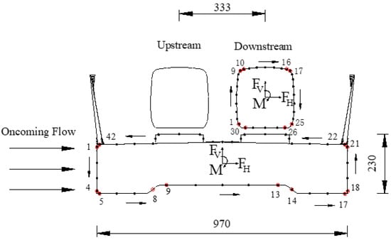 where CH, CV, and CM are the lateral force coefficient, lift coefficient, and moment coefficient in the body axis system, respectively; FH, FV, and FM are the aerodynamic forces measured by the ATI-type scale, respectively; Li is the integration length represented by measurement point i; α is the outer normal vector angle of the pressure measuring hole in the model section; H and B are the characteristic height and width of the train and bridge, respectively; the torsional moment coefficient of the train–bridge system is calculated with the centroid of the train and bridge as the reference point.