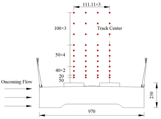 As shown in Figure 2, we used prototypes of the CRH380 HST and a blunt box girder bridge to conduct wind tunnel experiments. To avoid distortion of test results due to the Reynolds number effects, HST and bridge models were made at a large scale of 1:15. Under a uniform oncoming flow of 12 m/s, the model Reynolds number can reach 1.9 × 105. At this time, the bridge model is 0.23 m high and 0.97 m wide, and the train model size is 0.233 m (height) × 0.225 m (width). We set the measuring sections at 1/4, 1/2, and 3/4 of the model. Thirty measuring points were arranged for each train section, and 42 measuring points were arranged for each bridge section. To avoid the influence of distortion effects, the length of all pressure measurement tubes was set to 0.5 m. According to Xiang et al. [], the aperture size of the wind barrier may affect the test results. Considering that the aperture of the wind barrier model will be smaller than 2 mm after being scaled proportionally, it will affect the formation of the jet through the pressure relief hole. Therefore, under the premise of ensuring the same area of the ventilation surface, the pressure relief holes on the barrier are enlarged and rearranged in the corresponding positions. The wind tunnel experiments were carried out in the high-speed test section of the wind tunnel laboratory at Central South University. The size of the test section is 15.0 m (length) ×3.0 m (width) × 3.0 m (height). Considering the limitation of the maximum (max) blockage ratio of the wind tunnel experiment, the model length is defined as 2 m. The model is placed at a height of 1.6 m from the ground, and large end plates are placed on both sides to effectively avoid the interference of end effects and wind tunnel wall effects on the test results. All models are made of high-strength ABS sheets to ensure sufficient rigidity. The wind field test uses a mobile testing system independently developed by Central South University, which can accurately control the spatial position of the Cobra probe through the mobile measurement frame and self-developed control software. The wind velocity point layout scheme is shown in Figure 3, and a gradually denser layout is adopted from the top to the bottom. A total of 4 test surfaces and 44 wind velocity measurement points are arranged from the windward side to the leeward side of the track centerline. The sampling frequency of the Cobra probe manufactured and calibrated by Turbulent Flow Instruments (TFI) Company is set to 2048 Hz, and the sampling time was 20 s. Each measurement point collects 40,960 data points to ensure the reliability of wind velocity test results.
