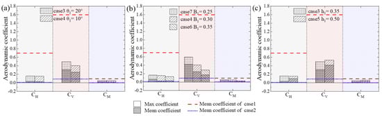 When the train is on the leeward side of the track, due to the influence of the bridge deck on the wind field, different lane positions can also cause differences in the aerodynamic characteristics of trains []. As shown in Figure 5, the effects of various WGB parameters on the mean aerodynamic coefficient of the train are similar. However, the magnitude of the mean aerodynamic coefficient and the difference in the mean aerodynamic coefficient caused by the parameter changes are greatly reduced compared to when the train is on the upstream side. This may be because the entire train is in the low-pressure wake of the barrier, away from the flow separation point.