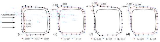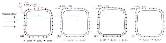 Testing the surface pressure distribution of trains can help understand the reasons for changes in train aerodynamics. Figure 6 shows the distribution of mean wind pressure on HST upstream. When the train is on the upstream side of the track, Figure 6a shows that after installing the WGB, the leeward part of the train roof and bottom, as well as the mean wind pressure on the leeward side of the train, remain almost unchanged, but the mean wind pressure on the windward side of the train changes from positive to negative. Compared with vertical wind barriers, the installation of the guide vanes does not significantly change the overall wind pressure distribution of the train, which verifies the view that WGBs have the same train protection effect as the vertical wind barriers mentioned earlier. It is worth noting that when the WGBs are installed, there is an increase in suction force at the shoulder of the train, which may be due to the upward deflection effect of the secondary deflection angle on the airflow. When θ1 = 10°, as shown in Figure 6b, compared with θ1 = 20°, the barrier blocks more airflow, resulting in lower pressure in the low-pressure area behind the barrier, which enhances the overall negative pressure of the train. The shoulder part is more sensitive to the changes in the inflow as it is immersed in the separated airflow, so it shows more obvious differences, which can also be observed in cases when h1 is changed. Surprisingly, as shown in Figure 6c, changing B1 does not significantly affect the mean wind pressure on the bottom of the train. When B1 is increased from 0.25 m to 0.3 m, only the trend of the separation point moving up and the weakening of the suction force at the shoulder of the train can be observed, and further increasing B1 will not significantly change the mean wind pressure on the train.
