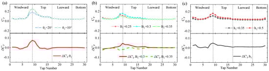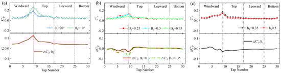 Effect of WGB parameters on HST fluctuating pressure (leeward): (a) angle of the main deflector plate θ1; (b) width of the WGB root B1; (c) size of the upper deflector angle h1.