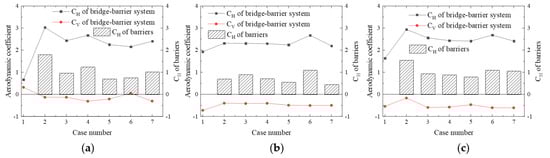 Aerodynamic coefficients of bridge and barrier: (a) without train; (b) the train is located windward; (c) the train is located leeward.