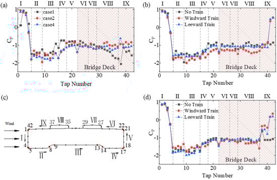 Wind pressure distribution on the bridge: (a) with or without wind barriers (for upstream trains); (b) installing a WGB for different train and bridge combinations in Case 2; (c) bridge pressure zoning; (d) installing a WGB for different train and bridge combinations in Case 4.