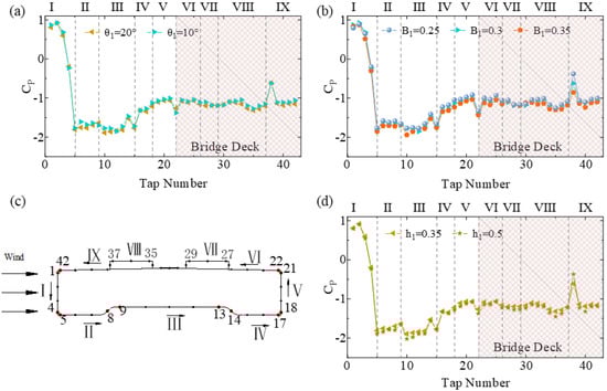 Effect of WGB parameters on bridge wind pressure distribution: (a) angle of the main deflector plate θ1; (b) width of the WGB root B1; (c) pressure distribution zones on the bridge; (d) size of the upper deflector angle h1.