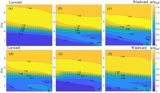 Effect of various WGB cases on streamwise wind velocity for the bridge deck: (a) Case 2; (b) Case 3; (c) Case 4; (d) Case 5; (e) Case 6; (f) Case 7.