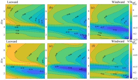 Effect of various WGB cases on transverse wind velocity for the bridge deck: (a) Case 2; (b) Case 3; (c) Case 4; (d) Case 5; (e) Case 6; (f) Case 7.