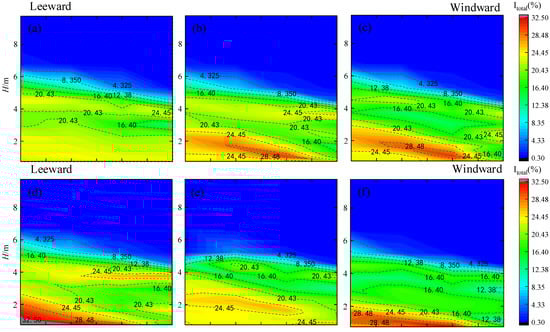 Effect of various WGB cases on turbulence intensity for the bridge deck wind field: (a) Case 2; (b) Case 3; (c) Case 4; (d) Case 5; (e) Case 6; (f) Case 7.