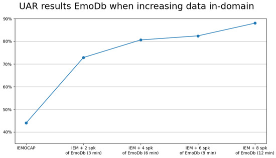 Accuracy in terms of UAR for EmoDb database with a progressive increment of audio in-domain in the training set.