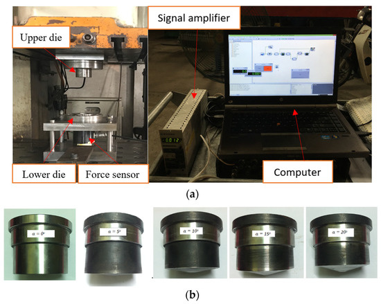 With the modules calculated, designed, and selected, the next step is to assemble these modules sequentially. Initially, the complete set of molds is assembled, positioned, and clamped on the slide and table of the FCP-160-ton crankshaft press. Subsequently, the sensor is placed beneath the intermediate die and clamped to the lower die assembly. Through cables and wires, the sensor is connected to other modules in the mold and measuring device system. The experimental system is finalized, as depicted in Figure 4a, and the forming punches feature different angles of inclination, shown in Figure 4b.