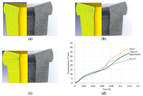 The deformed shape obtained from both simulation and experiment: (a) strain rate of 0.1 S−1, (b) strain rate of 10 S−1, (c) the simulation results considering both elevated temperature and strain rates equation, and (d) flange-forming force graph from simulation along with the corresponding experimental data.