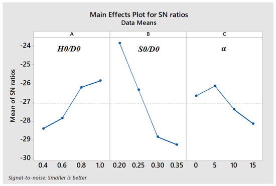 The (S/N) ratio (Equation (5)) is computed for each trial, signifying product deformation degree. The objective function is the flange-forming force (P) post-forging, influenced by H0/D0, S0/D0, and α, each with four levels detailed in Table 7. Forming force and S/N ratios are tabulated in Table 8. The mean signal/noise ratios per factor level are determined as Equation (6), displayed in Table 9. Figure 6 illustrates the impact levels of H0/D0, S0/D0, and α on flange force: