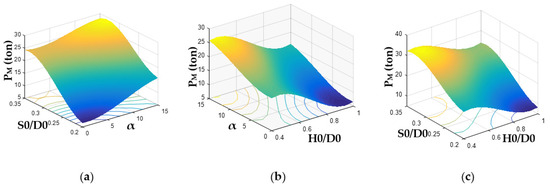 To assess the reliability of the regression function (Equation (13)), we conduct an ANOVA analysis. The results are shown in Table 10, indicating that the regression coefficient R2 is 0.98 and the Fisher coefficient F is 1.6741. Both values are lower than the critical value of 8.7 (based on the Fisher criteria), demonstrating high confidence in the mathematical model’s dependence on the parameters H0/D0, S0/D0, and α.