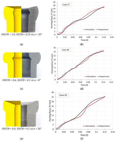 Comparison between the deformed shapes and corresponding flange-forming force for different case No. 17 (a,b), No. 18 (c,d) and No. 19 (e,f).