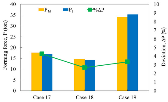 Moreover, this study encompasses a comparative assessment between the flange-forming force values derived from the formulated mathematical model (Equation (11)) and the corresponding experimental outcomes. For this evaluation, three sets of randomized parameters are employed for both simulation and testing. Employing the input parameters (H0/D0 = 0.6; S0/D0 = 0.2; and α = 0°), the simulated and experimental profiles presented in Figure 9a exhibit a close similarity to the shape of the flange after the forming process for C45 billet tubes. The discrepancy in the flange-forming force between these two instances amounts to 2.96%, as indicated in Table 11 and illustrated in Figure 9b. In the subsequent case, employing parameters (H0/D0 = 0.6; S0/D0 = 0.2; and α = 0°), the simulated and experimental profiles reveal creases during the flange-forming process, as depicted in Figure 9c. The deviation in forming force between these profiles reaches 3.52%, as illustrated in Figure 9d. Finally, when utilizing the parameter set (H0/D0 = 0.4; S0/D0 = 0.3; and α = 20°), corresponding to the largest punch angle among the cases, the simulated and experimental profiles in Figure 9e demonstrate a consistent geometry of the flange detail during the forming process for C45 billet tubes. The deviation in forming force between these profiles is the smallest, with a value of 1.42%, as depicted in Figure 9f. Additionally, a comparison of forming force results between the mathematical model and the experiment is presented in Table 11 and Figure 10. Notably, the largest deviation of 4.26% is observed for the mathematical model when compared with the experimental results. These findings provide robust evidence for the high dependability of the mathematical model in effectively characterizing the flange-forming force during the flange-forming process of C45 billet tubes, based on the pertinent geometric parameters of the procedure.