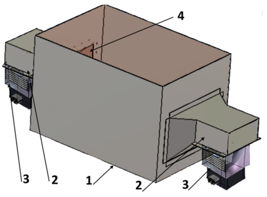 Outlay of convective-microwave zone for grain processing: (1) casing of convective-microwave unit; (2) waveguides; (3) magnetrons; and (4) waveguide output gate.