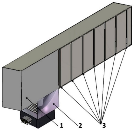 Outlay of 55 × 110 waveguide with slot-type emitters: (1) waveguide casing; (2) magnetron; and (3) slot-type emitters spaced at intervals of ½ λ.
