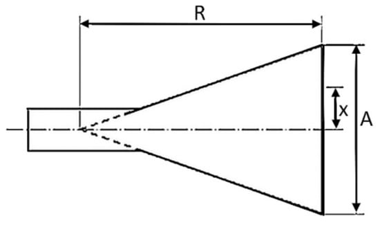 The gain of a horn antenna reaches its maximum at specific values of the aperture size (phase error at the edge of the aperture). For an N-sector horn, this phase error is 3π/4, and such horns are referred to as optimal [33]. The dimensions of optimal horns are determined by substituting the above-mentioned phase shift values into Equation (7) with the above values of phase displacement on the aperture edge: , for an N-sector horn. For a frequency of 2.45 GHz, the wavelength is 122 mm. In the horn design, we adopt R = 80 mm, which is the distance from the point of radiation of the magnetron to the end of the horn. Thus, the aperture size = 171 mm. However, due to size limitations in the module block construction, where the power supplies and magnetrons are located, A is taken as 88 mm.