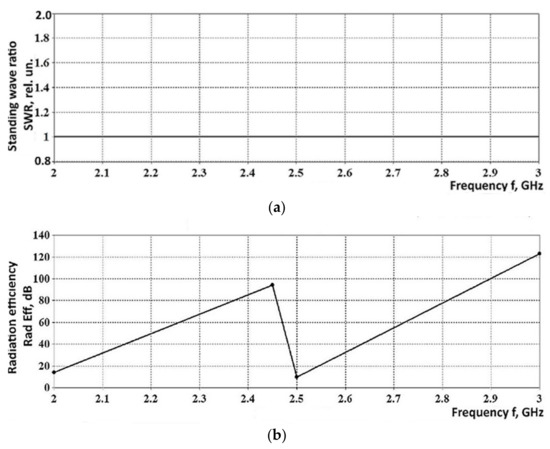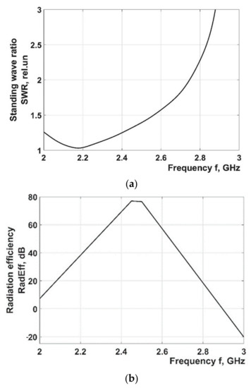 Frequency dependences obtained by mathematical simulation for microwave field in rectangular (55 × 110) radiator: (a) frequency dependence of the standing wave ratio (SWR) for rectangular slot type radiator and (b) frequency dependence of the radiation efficiency for rectangular slot radiator.
