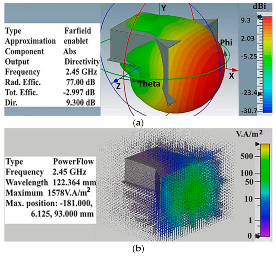 The 3D angular patterns of directionality and distribution of radiated power for rectangular 50 × 110 waveguide: (a) 3D angular pattern of microwave electromagnetic field for rectangular slot-type radiator and (b) 3D diagram of microwave field density distribution for rectangular slot-type radiator.