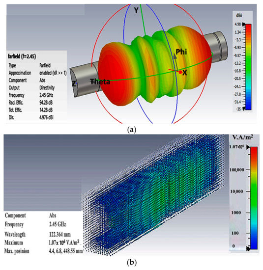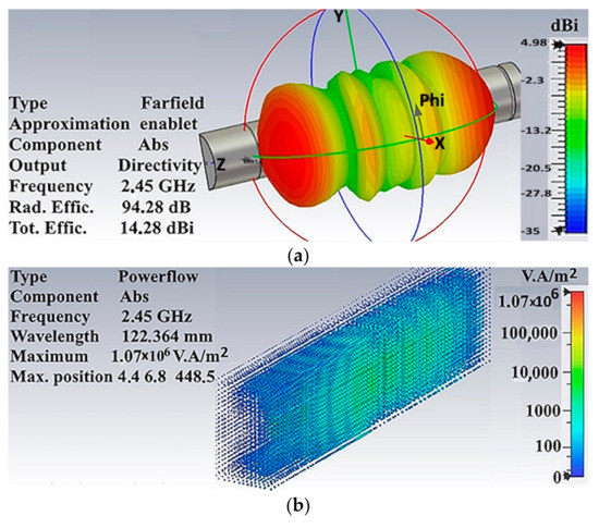 Radiator parameters were first conformed and then were input into CST Microwave Studio software for mathematical simulation of the electromagnetic field distribution from the radiator’s slots. The results of this simulation are presented in Figure 12 and Figure 13.