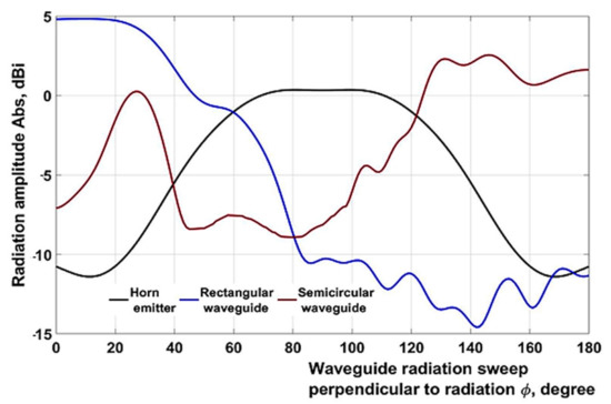 A comparison of the radiation efficiency values for the three types of waveguides under study showed that the semicircular waveguide has the best data. However, the distribution of radiated power shown in Figure 11b, Figure 13b and Figure 15b does not fully allow us to estimate the change in the distribution of the electromagnetic field along the waveguides. Therefore, Figure 16 shows graphs of directional patterns for three types of waveguides.