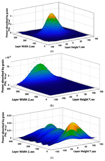 It should be noted that grain drying is a rather energy-demanding process that accounts for 80% of aggregate energy consumption. That is why various methods designed to reduce the energy consumed for drying, including the application of infrared radiation [9], ozone-air mixtures as drying agents [10], and processing plants with ultrasonic grain drying effect [11] are applied. Grain dryers with alternating blow-through directions in the grain layer [12] and those with grain recycling are also widely used [13]. One of the environmentally safe grain-drying methods is treatment in convective-microwave processing plants [14,15]. The application of microwaves for processing grains with the purpose of drying, disinfection, and pre-seeding treatment makes it possible to reduce energy consumption and enhance the productivity of the dedicated equipment [16,17,18]. In the course of pre-seeding treatment, there is a possibility to combine the effect of disinfection with that of improving both the viability of seeds and the yield formula [19,20].