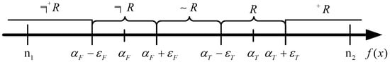 For any of the dimensions of normality, completeness, accuracy, and timeliness, with the help of MMTD formal logic, let the set be the set of mobile emergency big data, and be some function of data and quality degree. Its quality predicate is , and the high or low degree of can measure the quality of mobile emergency big data. If the quality predicate for particularly low degree, for low degree, for high degree, for a particularly high degree, and for the transition between a high and low degree is noted. Then, there are standard degrees and , corresponding to and in the “true value region” , and the “false value region” . Figure 4 shows the correspondence between the values, and Table 1 shows the correspondence between predicates and quality levels.